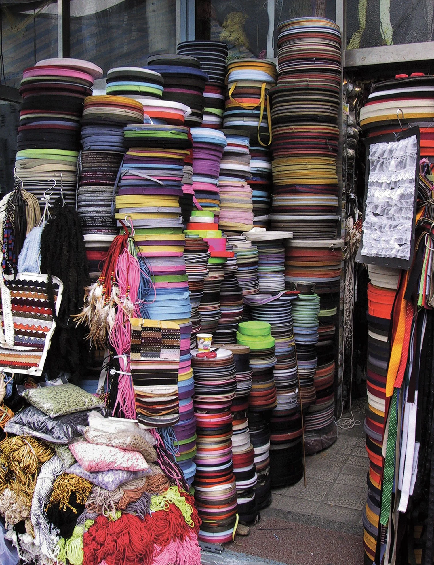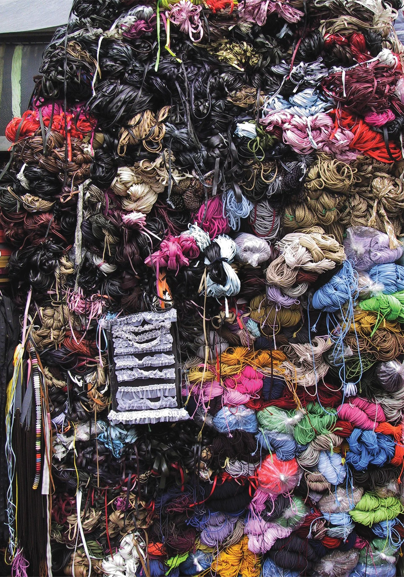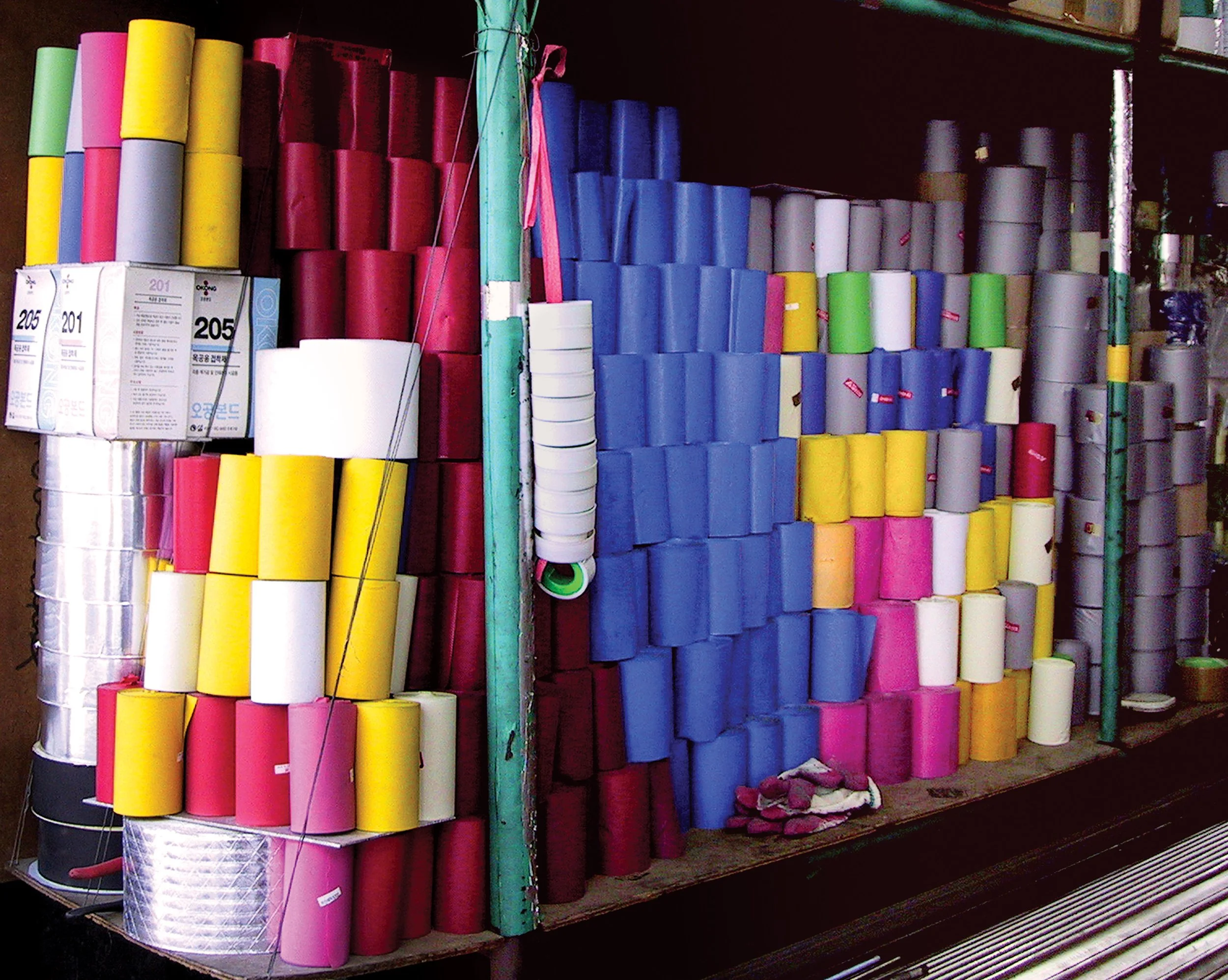 In her Found Installation series, Shin photographed occurrences of accumulated objects in the open markets of Seoul. The images are cropped so as to make no reference to a specific place as if they could have been taken anywhere. The piles of objects, carefully stacked and organized, become abstracted and removed from their commonplace origins. Thus, the photographs suggest that materials become global and, in turn, non-specific to one culture or marketplace.