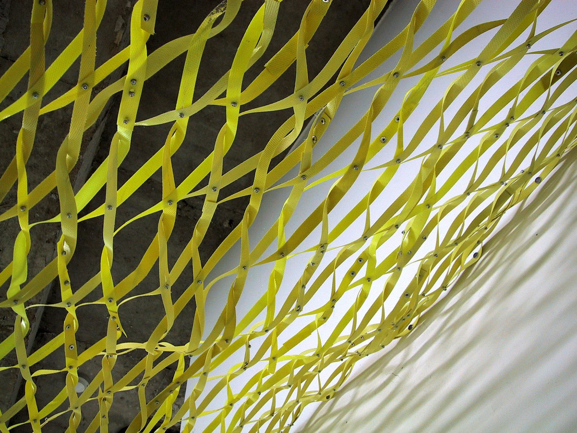 Yellow nylon straps—commonly used to wrap around heavy cargo—were salvaged from a defunct book printing factory and riveted together to form a dense web. The straps were then returned to the factory space and installed in the form of an expansive safety net. Safety Net represents our need for assurance in a world where books and other forms of the printed word are increasingly becoming replaced by digital media.