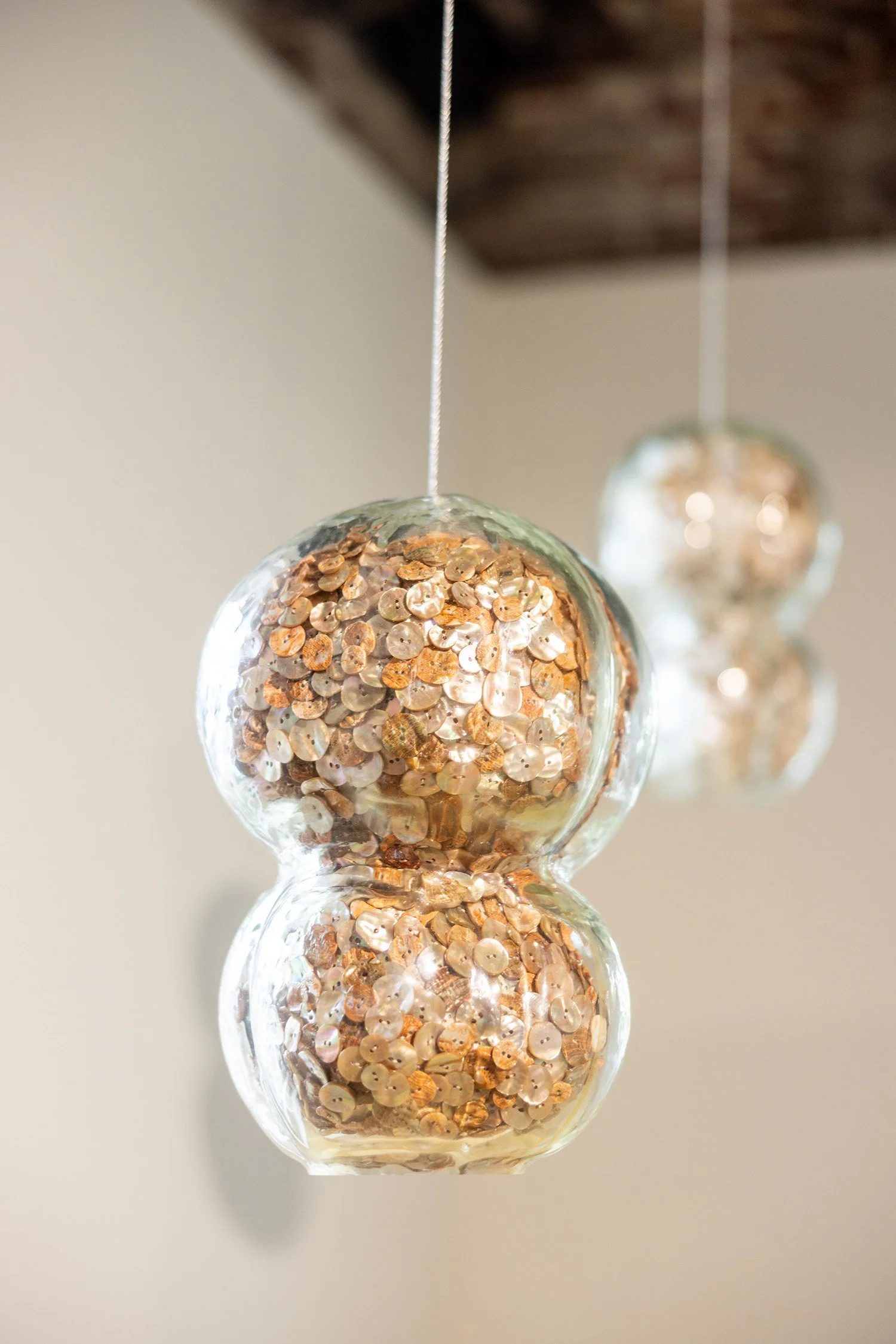 Blown glass orbs and mother-of-pearl buttons diverted from the landfill