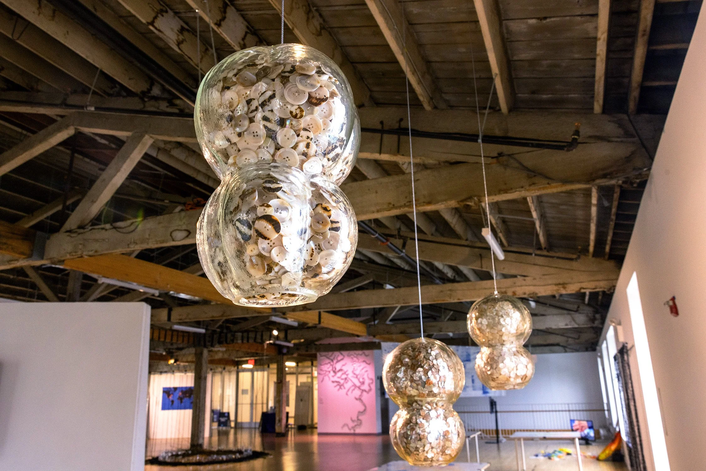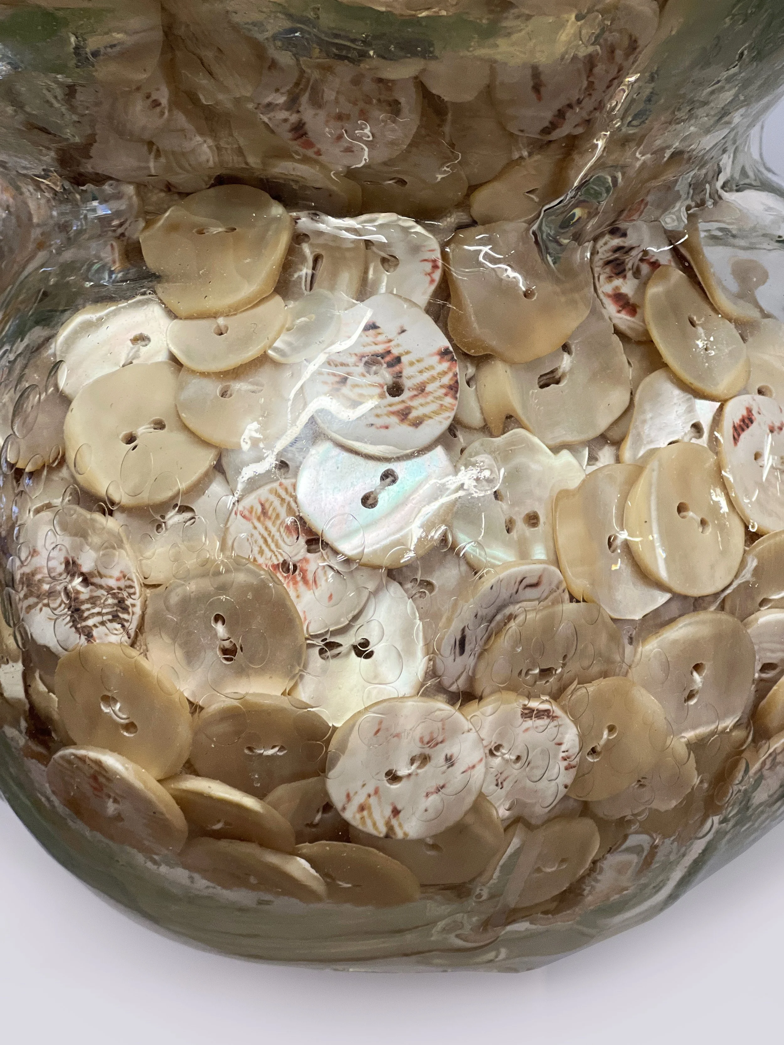 In Tidal Orbs, this glass now contains thousands of milky, iridescent mother-of-pearl buttons diverted from landfill, creating a dialogue between vessels that once nurtured living filter feeders and now memorialize their organic relatives, and bridging laboratory conservation efforts with material culture and overconsumption. Each orb turns industrial debris into a testament for resilience- honoring lost natural filtration services while celebrating ongoing restoration efforts.