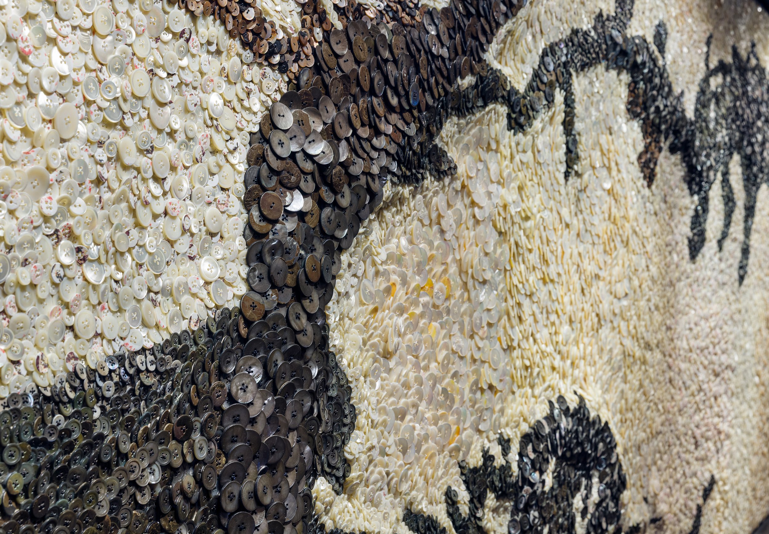 Made from the inner layers of shells, notably oysters and mussels, this mass of commonplace buttons, in Shin's hands, reflects on many historic layers of the Center's site. The traditional home of Indigenous peoples, primarily the Lenape, the rich marine life and ecosystems that were native to this area included plentiful oyster beds. Once known as "Oyster Island," in the mid-19th century the farming and distribution of oysters was one of the region's foremost industries.